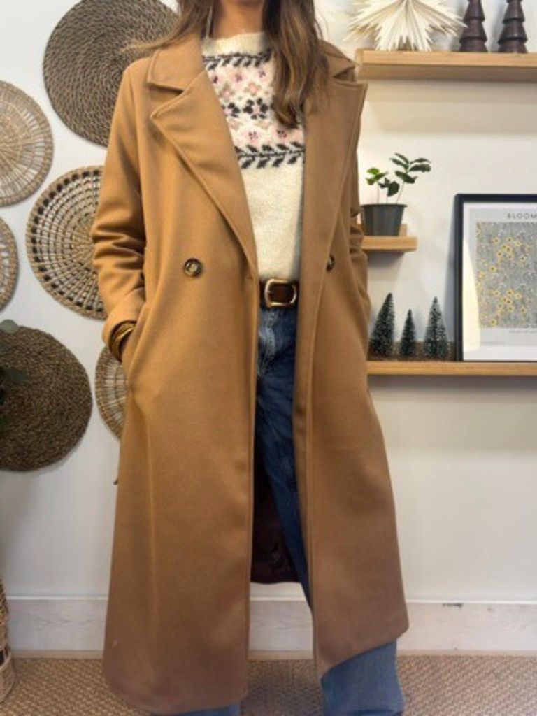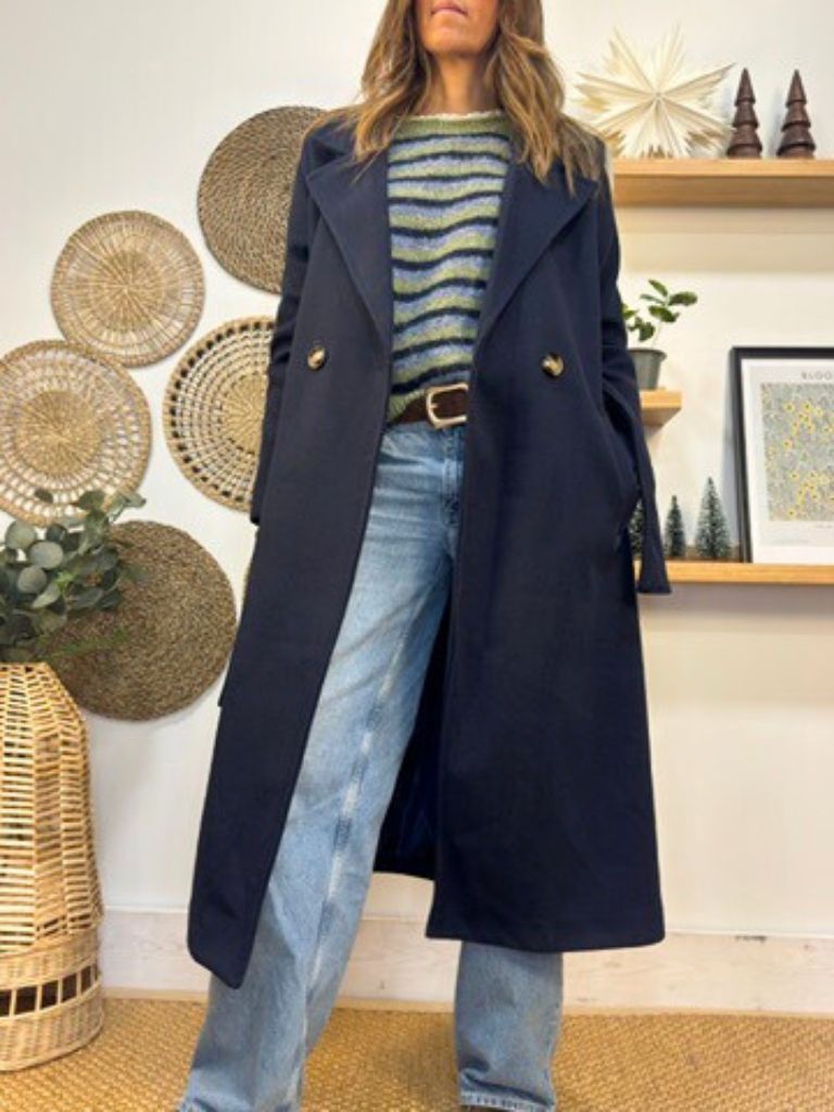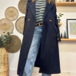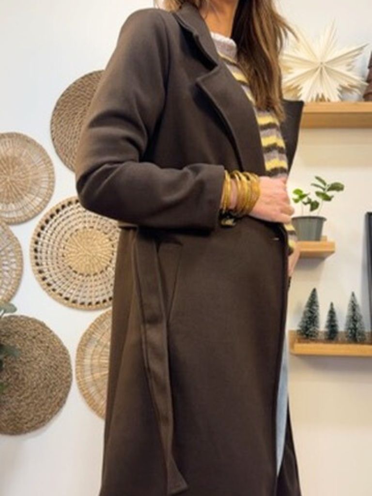 Abrigo largo de paño, con solapas ,dos botones y cinturón.