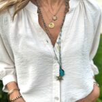 Blusa Capri con escote pico cuello mao y botones. Manga ranglan hasta codo.