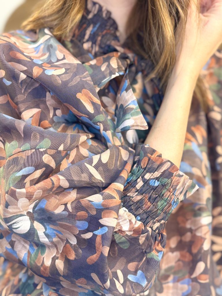 Blusa oversize de cuello fruncido elastico alto con lazo. Elastico en puño.
