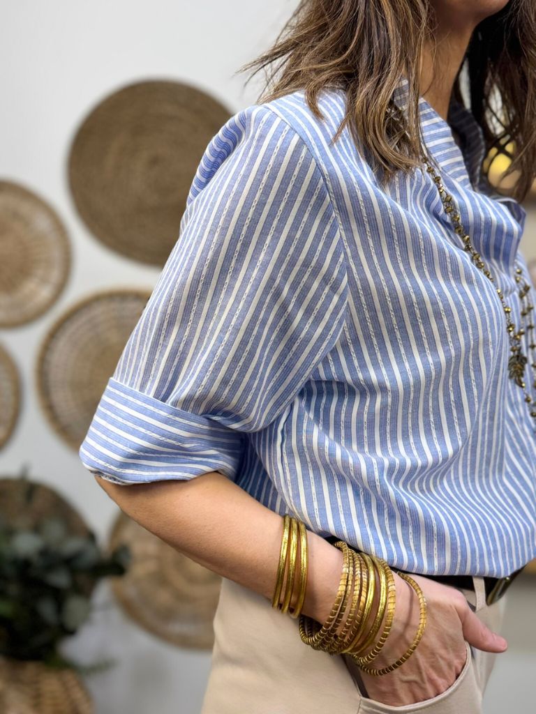 Blusón rayas con cuello mao y pico.Manga francesa con vuelta.