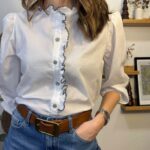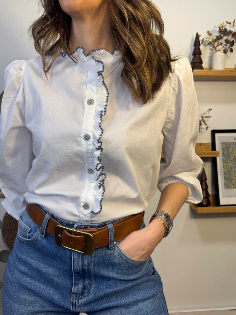 Blusa de algodón blanco con volante y vivo azul en volante.