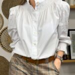 Blusa de algodón con botones , cuello subido de nido de abeja ,puño con elastico y volante.