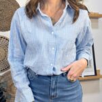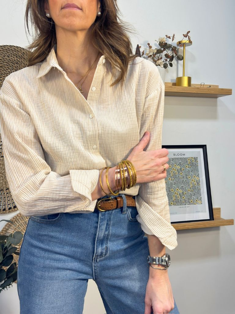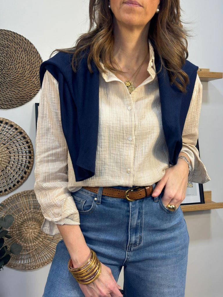 Camisa de rayas de algodón . Dos colores azul y camel.