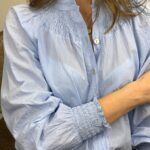 Blusa de algodón en azul con botones , cuello subido de nido de abeja ,puño con elastico y volante.