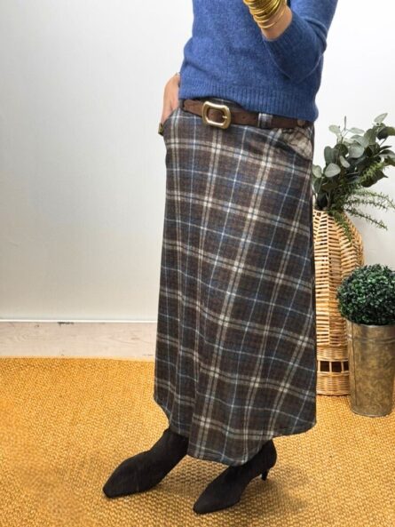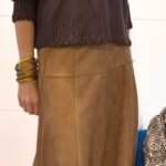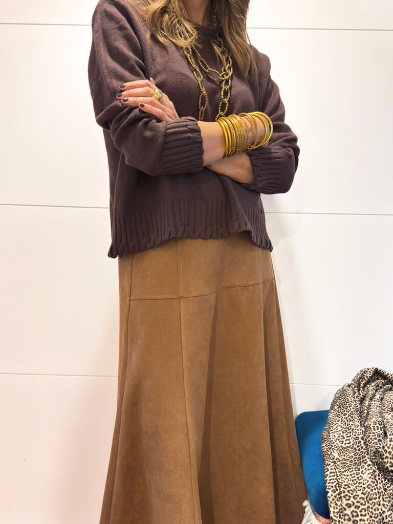 Falda midi de tiro medio confeccionada en antelina . Línea evasé y cintura elástica.