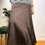 Falda midi de tiro medio confeccionada en antelina . Línea evasé y cintura elástica.
