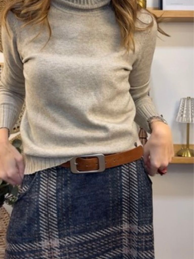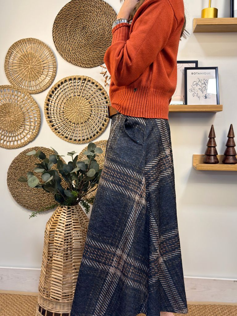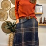 Falda midi de cuadros , con corte en evasé y  cintura elástica con trabillas para cinturón.