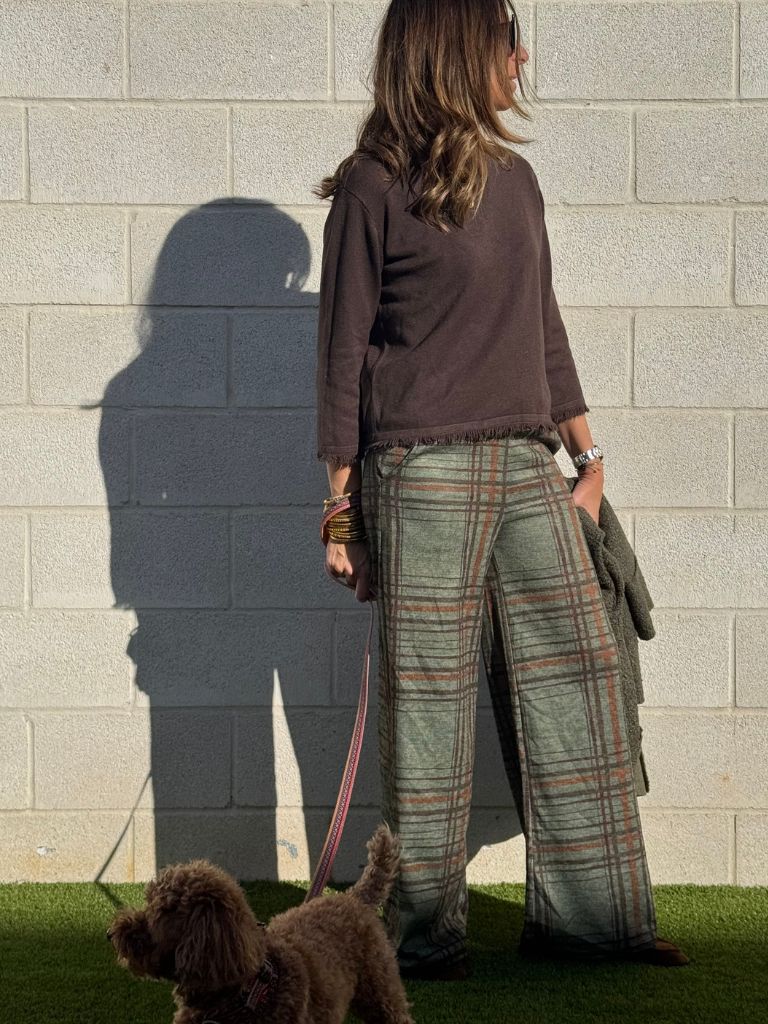 Pantalón de tiro medio confeccionado en franelina típica para la temporada de otoño invierno, bolsillo francés . Cintura elástica con trabillas para cinturón.