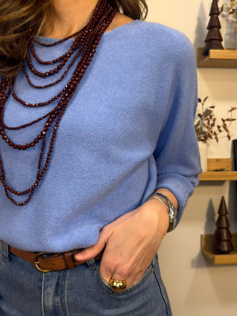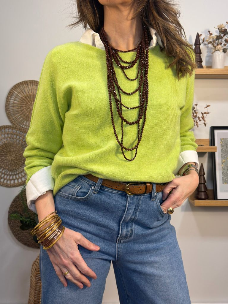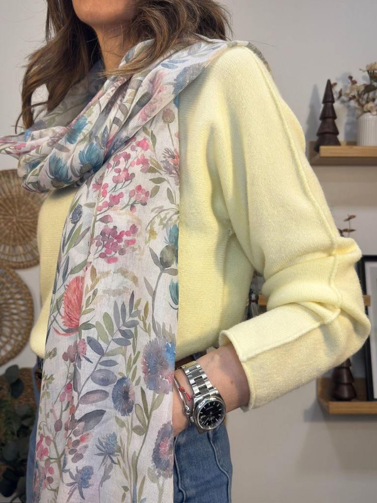 Jersey de tejido grosor medio, manga larga con colores primaverales cuello redondo .