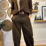 Pantalón barrel marrón. Goma elástica en parte trasera de la cintura. Trabillas para cinturón.