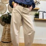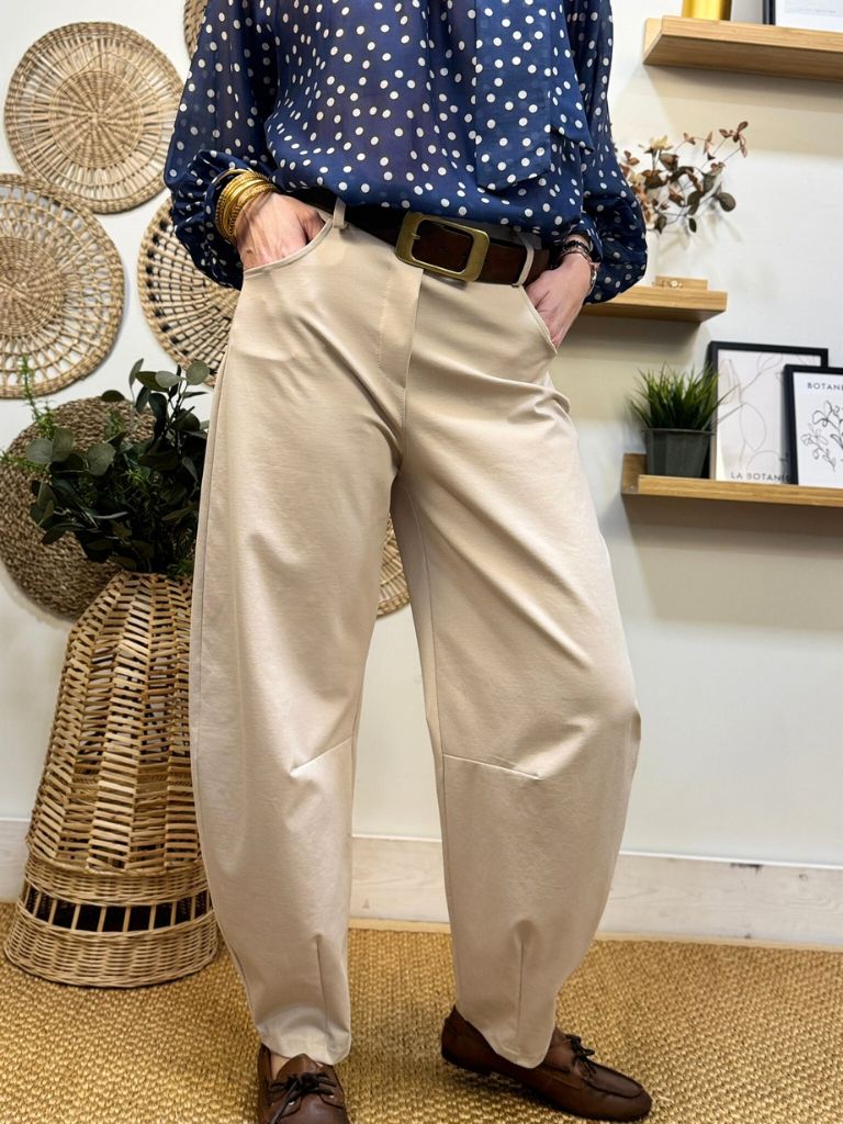 Pantalón barrel beige. Cintura elástica. Trabillas para cinturón.