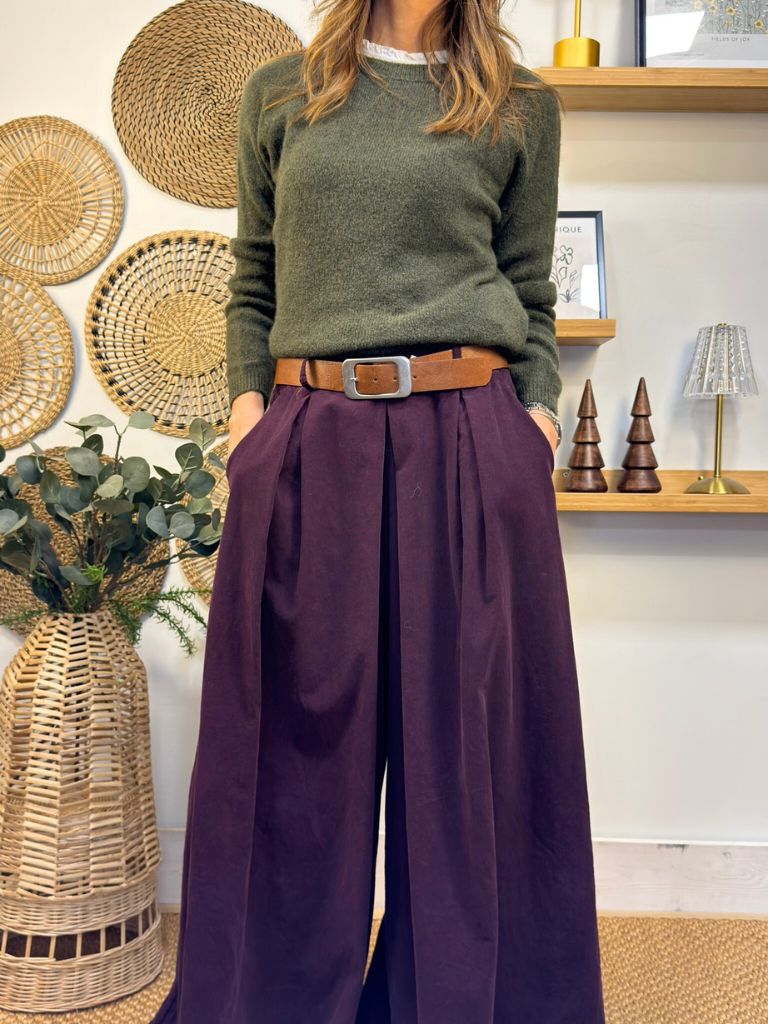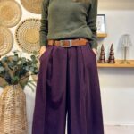 Pantalón de tiro medio con bolsillos laterales . Detalle de pliegues / pinzas delantera y parte trasera de cintura elástica. Pierna ancha. Cierre frontal con cremallera y botón.