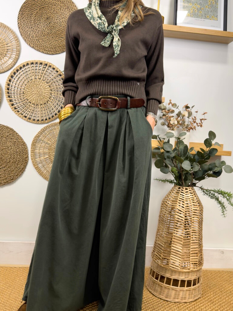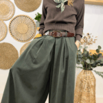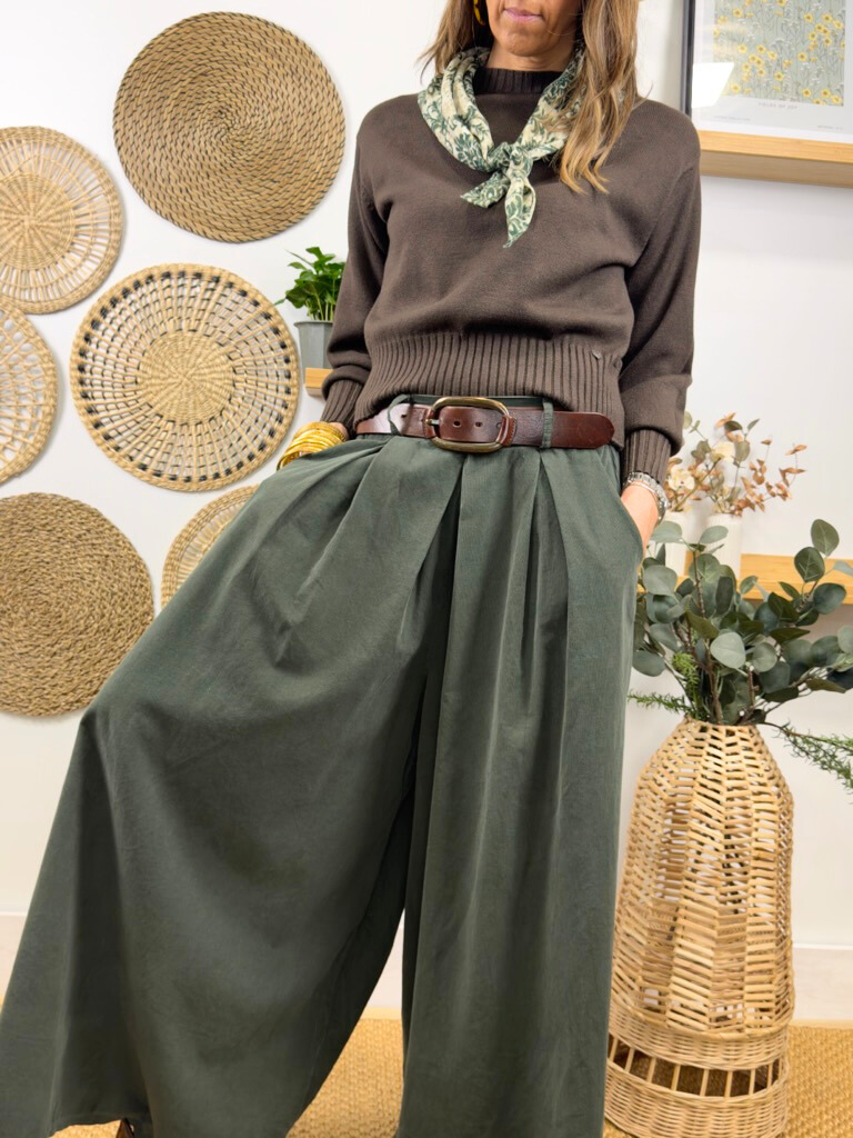 Pantalón de tiro medio con bolsillos laterales . Detalle de pliegues / pinzas delantera y parte trasera de cintura elástica. Pierna ancha. Cierre frontal con cremallera y botón.