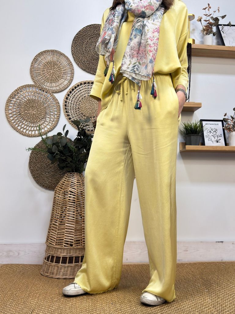 Pantalón raso, ancho , bolso francés con cintura elástica y lazo de adorno.