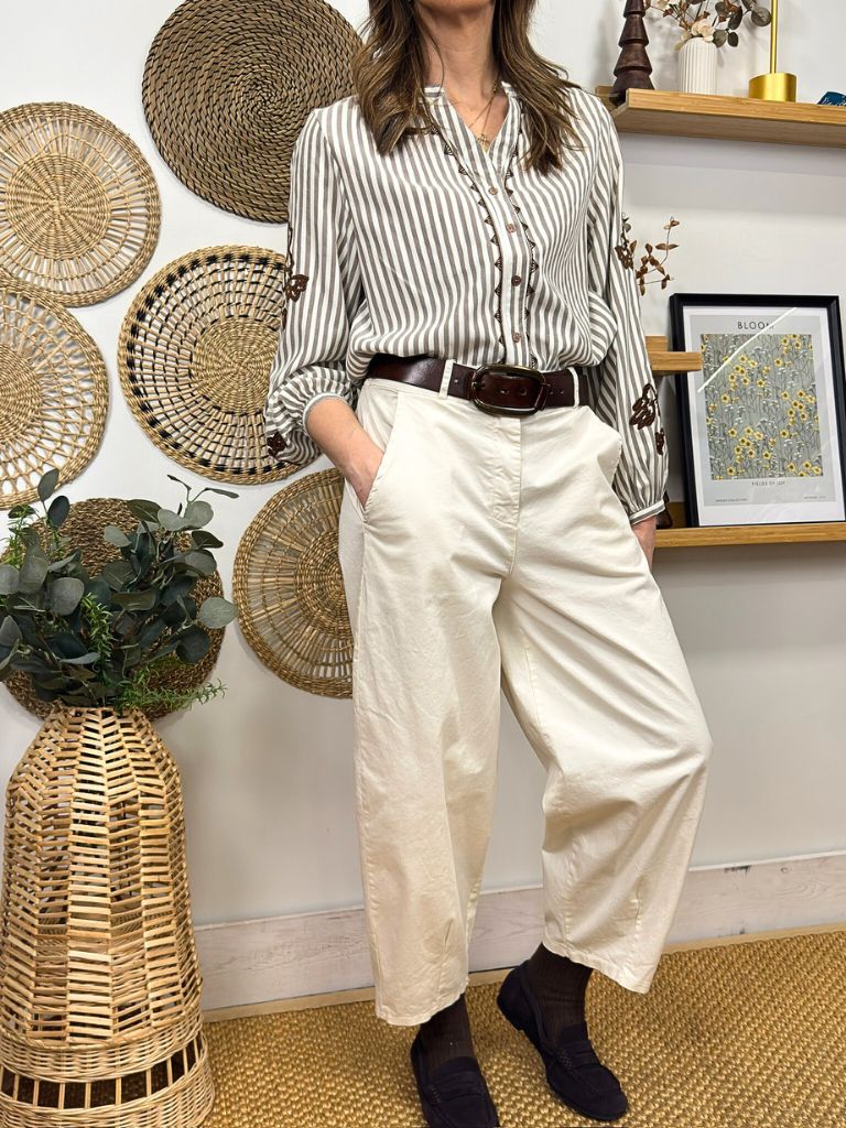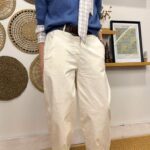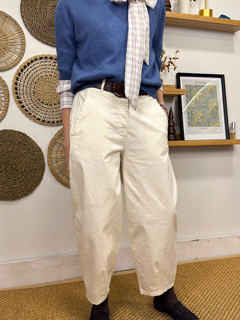 Pantalón Balloon en color beige , bolsillos franceses. En cintura botón y cremallera delantera y parte trasera goma elástica.